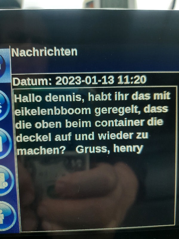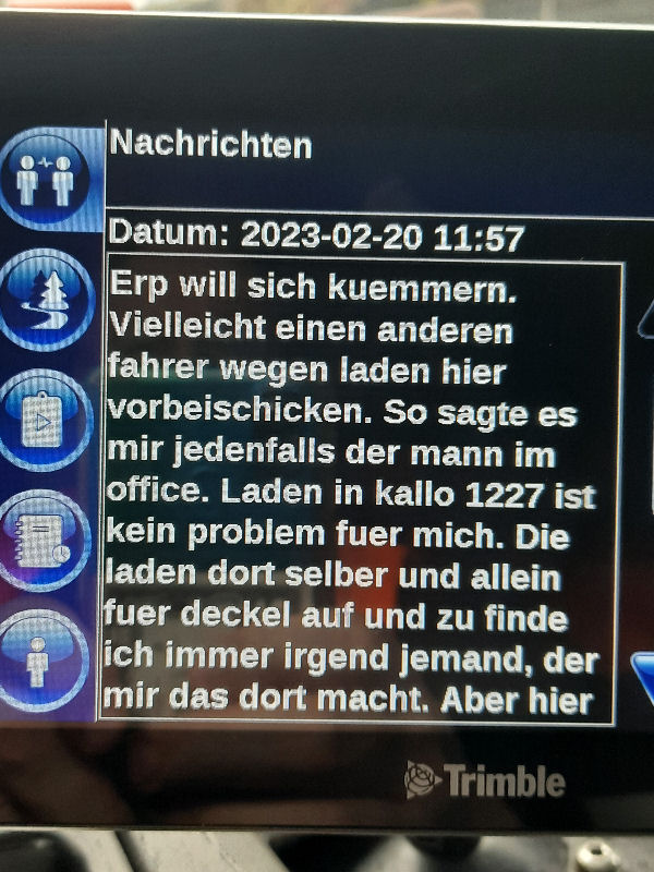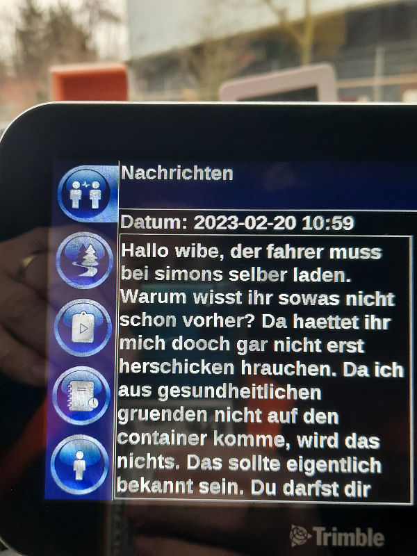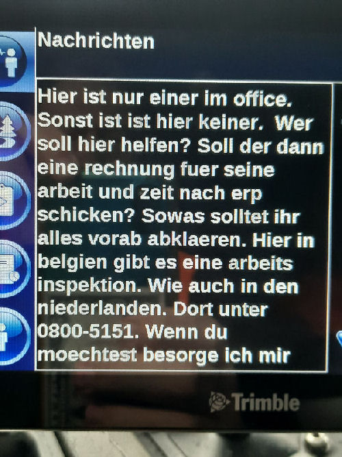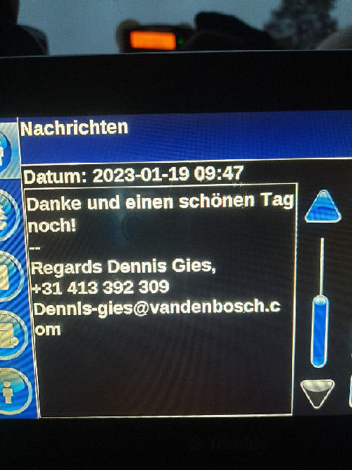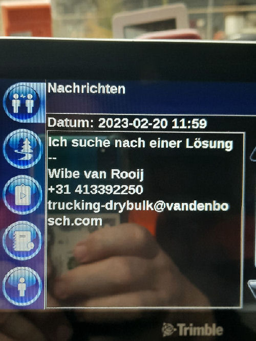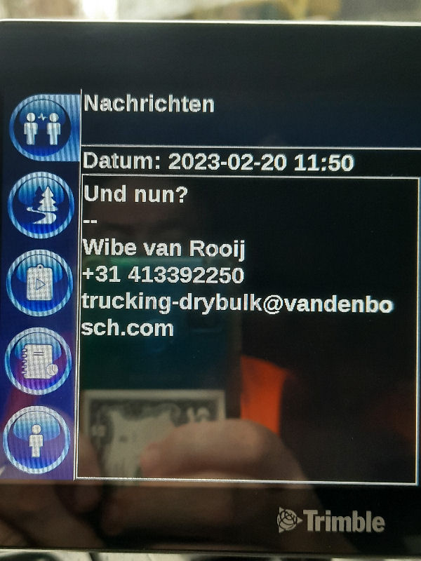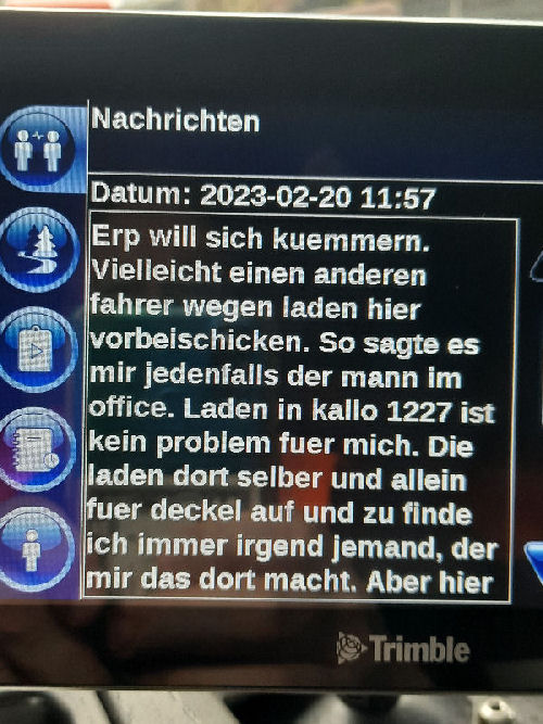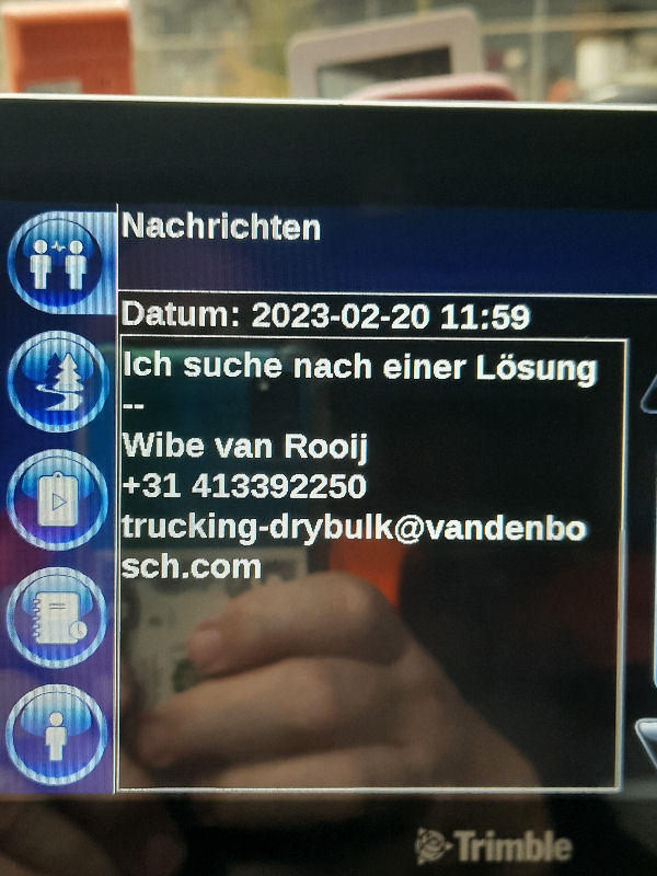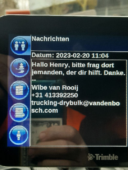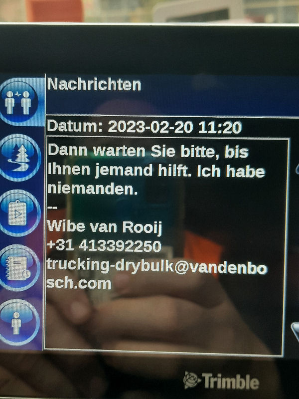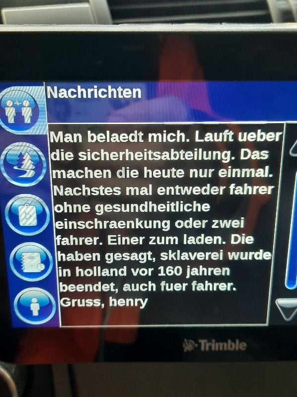 | I introduce myself: I have been working as an international truck driver for Van den Bosch for 15 years now. I am employed by the German Van den Bosch Transporte GmbH, which is 100 percent owned by the Dutch shareholder. All vehicle and deployment planning is done from there. --- In several European countries, the transport industry often means exploitation and wage theft for foreign drivers. No government or trade union and hardly any authority seems to mind much. Violations of working time laws and occupational safety rules are often standard practice. Unfortunately, today's Netherlands is no exception. In my case there is also discrimination against a severely disabled person. --- Laws and official regulations exist in large numbers. But it is of little use if such standards are not enforced and controlled locally. Some companies even go to great lengths to ensure that drivers do not even find out about laws that are advantageous to them. --- I myself have been severely disabled for years. In the GDR I worked as a miner for some time. That left its mark. My health impairment is known both to the superiors of the German GmbH and to those in the Dutch parent company in Erp. I have created a special website for them. In rare cases they take my health into consideration. Very rarely. If, through one or the other management level, drivers are only seen as lawless servants, one should of course not accept this as a person affected. Life is too short for lousy jobs. By the way, the much lamented shortage of drivers is no accident. --- Descriptions of the sometimes adventurous conditions in this industry, which often touch on the area of criminal law, will be given confidentially to the competent national and international authorities on request. In this case, please write to my address at the bottom of this page. --- Following screenshots of my on-board computer in the truck: communication between the planning in Erp and me as driver. Clicking enlarges the pictures in a new window. In the first eight weeks alone since the beginning of the year, there were five days of deliberate violations of occupational safety and discrimination against severely disabled workers. And that's just me - hundreds of drivers are on the road every day for Van den Bosch. --- |