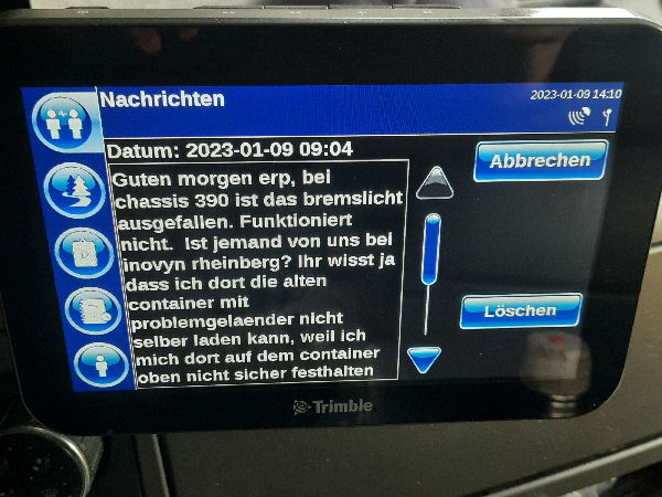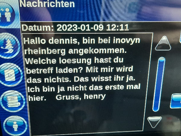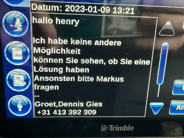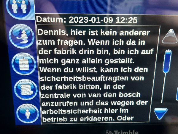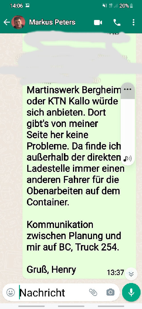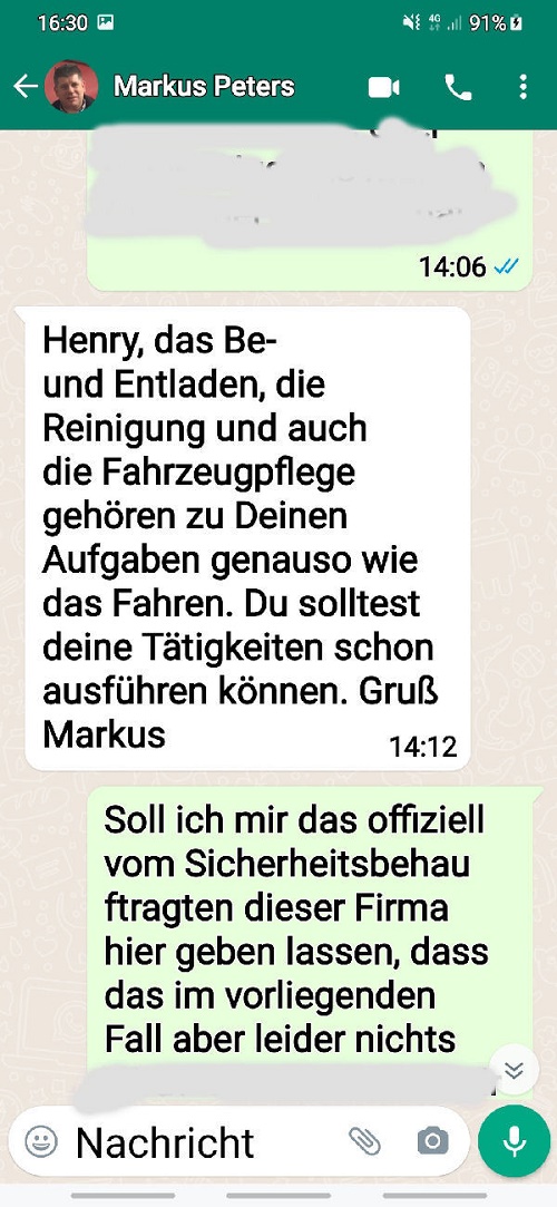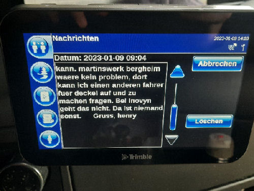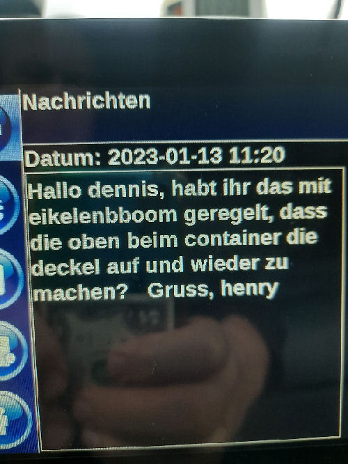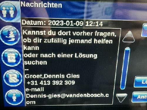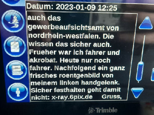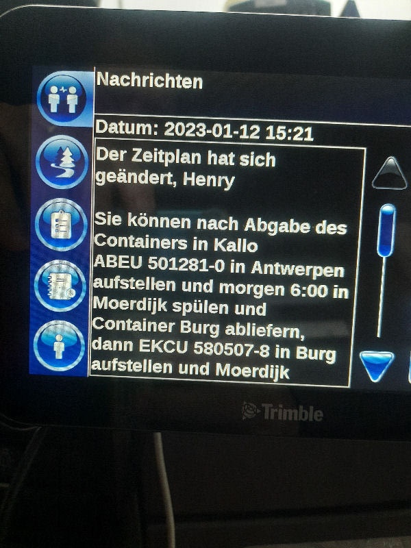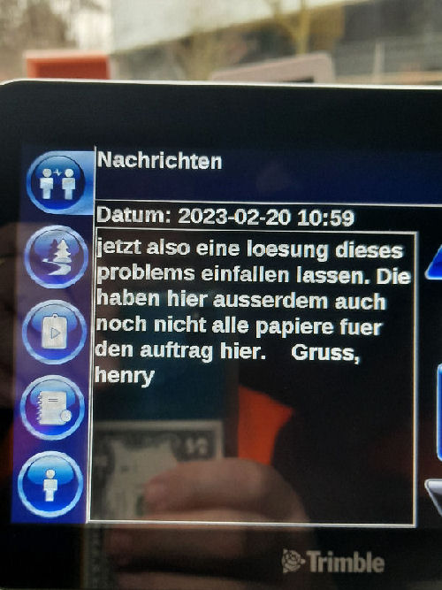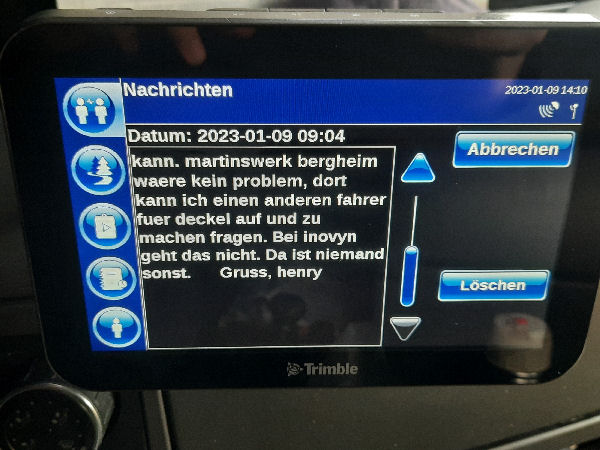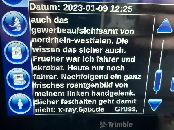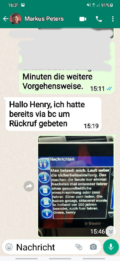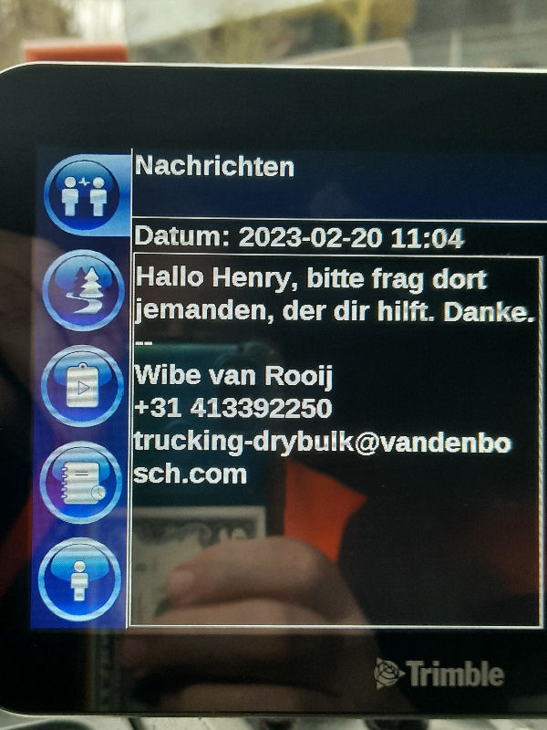 | I introduce myself: I have been working as an international truck driver for Van den Bosch for 15 years now. I am employed by the German Van den Bosch Transporte GmbH, which is 100 percent owned by the Dutch shareholder. All vehicle and deployment planning is done from there. --- In several European countries, the transport industry often means exploitation and wage theft for foreign drivers. No government or trade union and hardly any authority seems to mind much. Violations of working time laws and occupational safety rules are often standard practice. Unfortunately, today's Netherlands is no exception. In my case there is also discrimination against a severely disabled person. --- Laws and official regulations exist in large numbers. But it is of little use if such standards are not enforced and controlled locally. Some companies even go to great lengths to ensure that drivers do not even find out about laws that are advantageous to them. --- I myself have been severely disabled for years. In the GDR I worked as a miner for some time. That left its mark. My health impairment is known both to the superiors of the German GmbH and to those in the Dutch parent company in Erp. I have created a special website for them. In rare cases they take my health into consideration. Very rarely. If, through one or the other management level, drivers are only seen as lawless servants, one should of course not accept this as a person affected. Life is too short for lousy jobs. By the way, the much lamented shortage of drivers is no accident. --- Descriptions of the sometimes adventurous conditions in this industry, which often touch on the area of criminal law, will be given confidentially to the competent national and international authorities on request. In this case, please write to my address at the bottom of this page. --- Following screenshots of my on-board computer in the truck: communication between the planning in Erp and me as driver. Clicking enlarges the pictures in a new window. In the first eight weeks alone since the beginning of the year, there were five days of deliberate violations of occupational safety and discrimination against severely disabled workers. And that's just me - hundreds of drivers are on the road every day for Van den Bosch. --- |