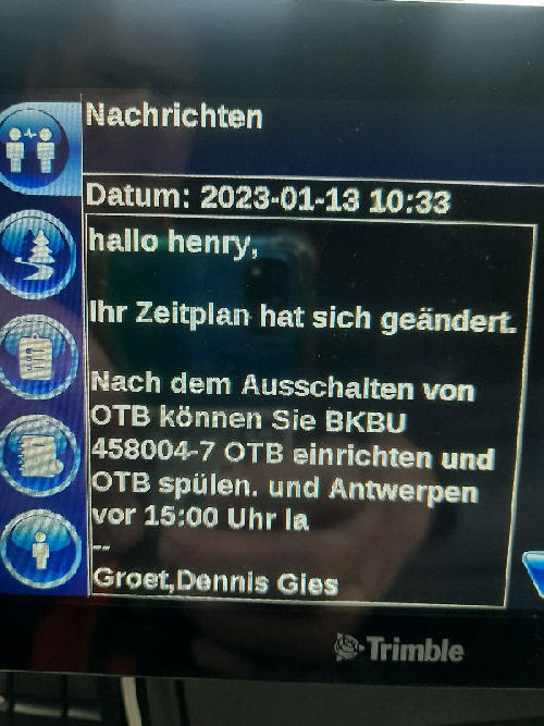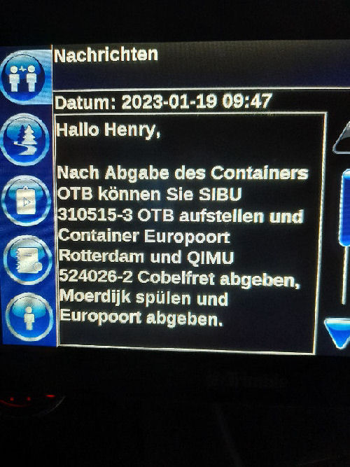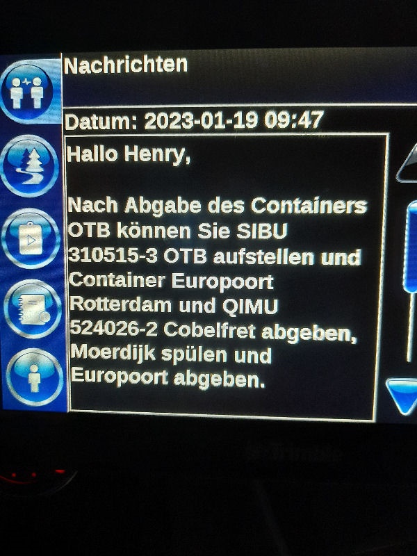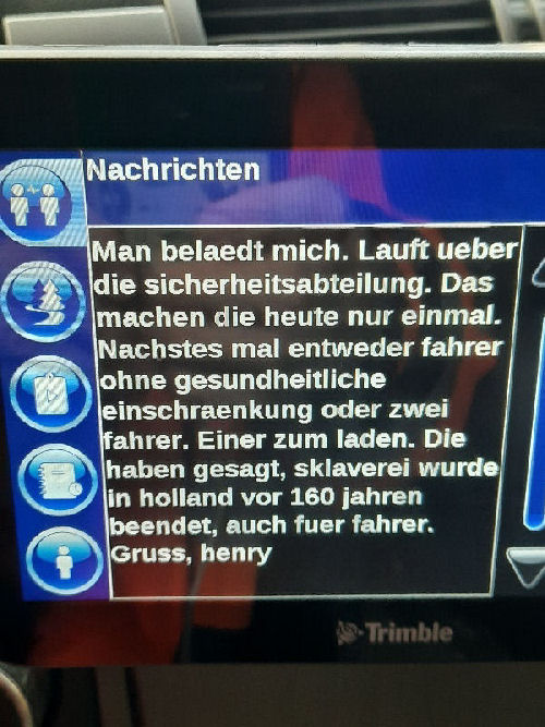 | Conclusion: I communicated via the on-board computer with planners - i.e. employees with rather limited competences. But the problem lies somewhere else. As we all know, the fish always stinks from the head ... --- Dear Dutch people, I think you are a clever people. And I assume that in your beautiful and friendly country modern slavery will also be history in the foreseeable future. As historical slavery has been for 160 years. All the best for you! --- Henry